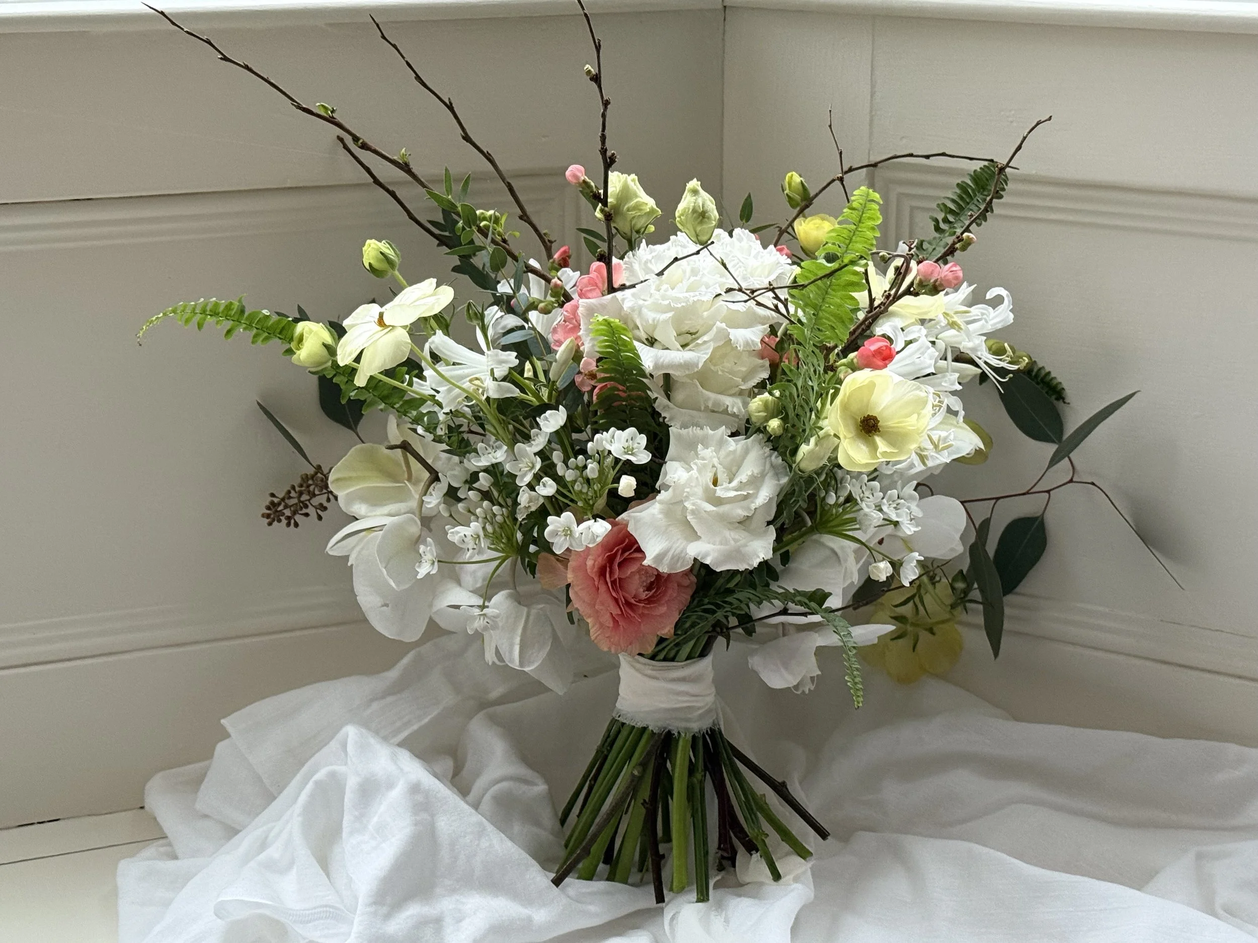 Spring flowers bring sunshine to the darkest of winter days. In these bouquets, created in late December for a Shantili and her bridesmaids, the delicate petals of butterfly ranunculus, kloon ranunculus and allium flocon brought spring freshness to the sumptuous orchids and lisianthus. Wedding floristry is all about individualism!!